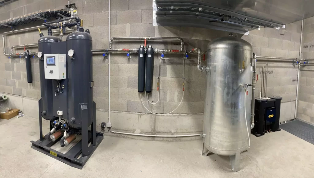 Nous sommes donc fiers de vous présenter cette belle installation complète avec compresseurs, sécheur, filtration, réservoir, traitement des condensats et un réseau en inox serti pour relier l’atelier de production.